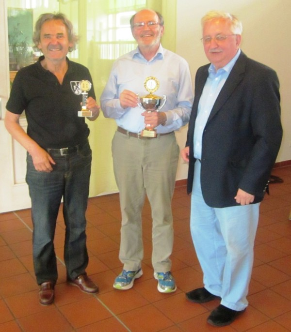 Seniorenwart Max Riedl (rechts) gratuliert Ü60 Sieger Heinz Däubler (Haselmühl) und Nestorensieger Heinrich Federer (FC Schwarzenfeld).