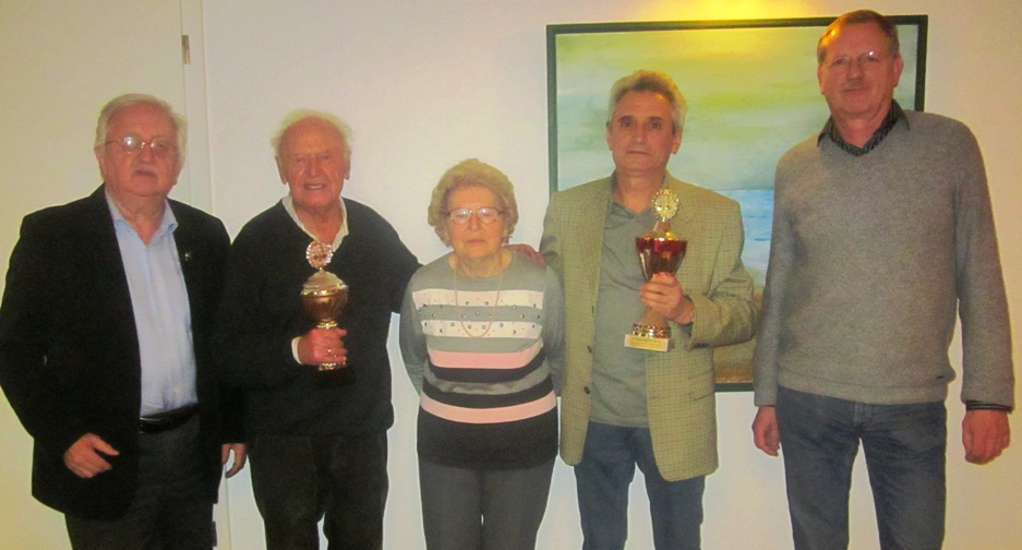 Siegerehrung bei der 6. Blitzschachmeisterschaft der Senioren ü 60: (von links) Max Riedl (Ausrichter Furth im Wald/Waldmünchen), Franz Kuchler (Nestorensieger), Sponsorin Josefine Brück, Turniersieger und neuer Blitzschach-Oberpfalzmeister Ü60 Johann Schmidt (SK Weiden 07), Klaus Frieser (neuer Seniorenwart des SVO)